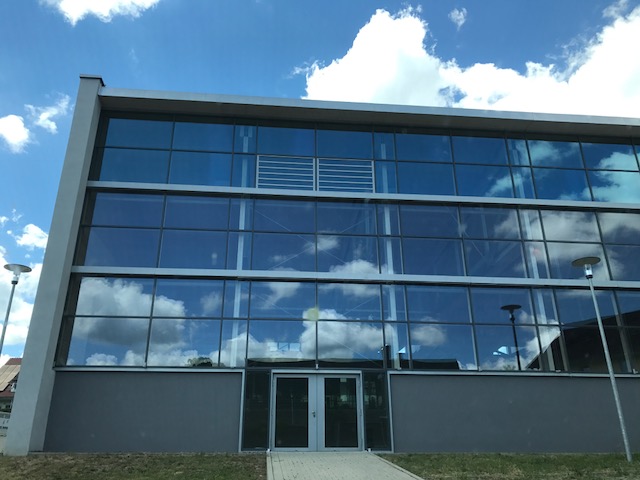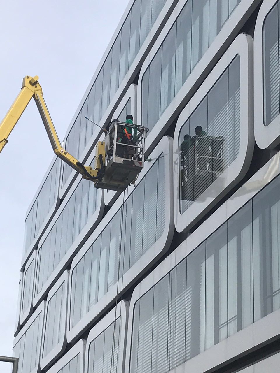 Alle moderenen Techniken zur gründlichen und schonenden Reinigung aller Materialien stehen uns und damit Ihnen zur Verfügung. Hier sehen Sie die Reinigung einer Aluminium- fassade im chemiefreien Osmoseverfahren. |